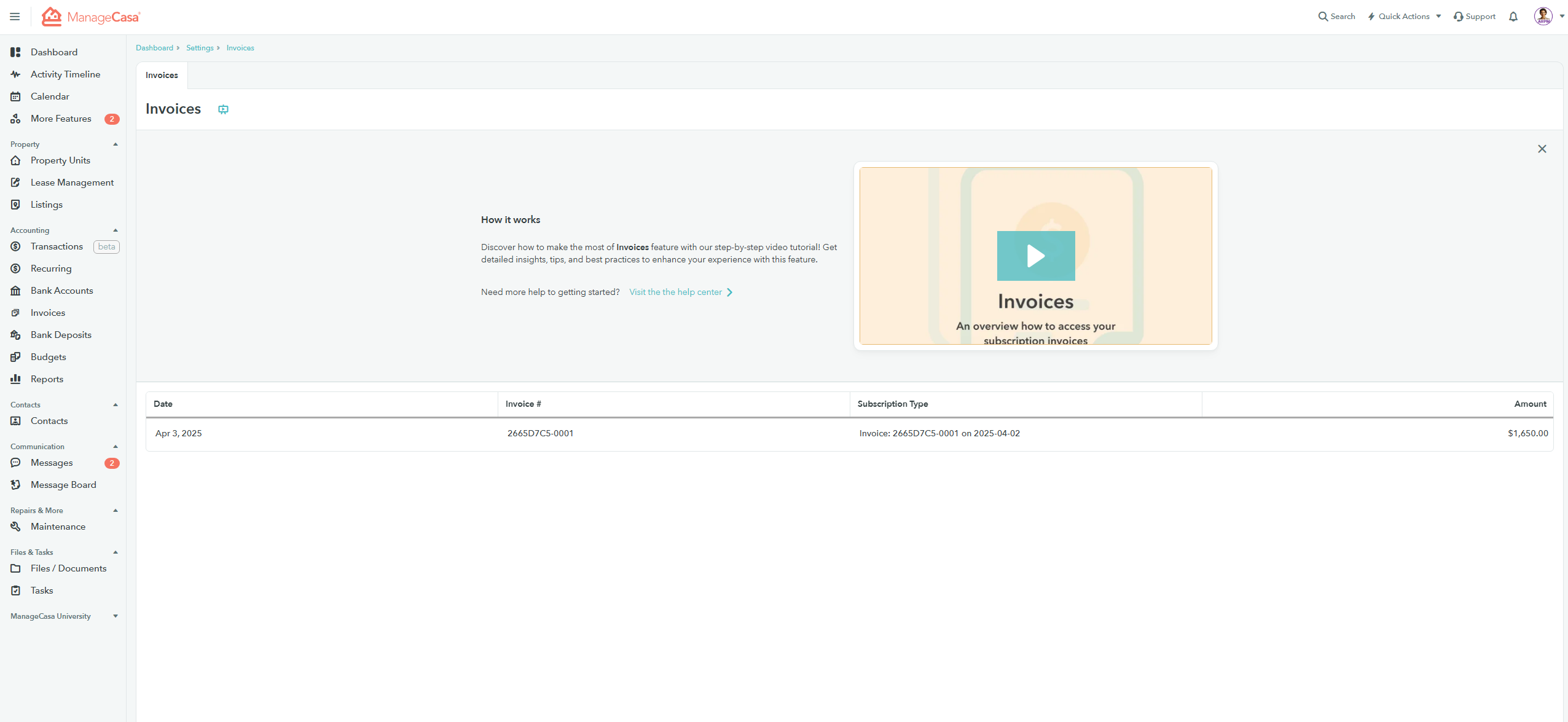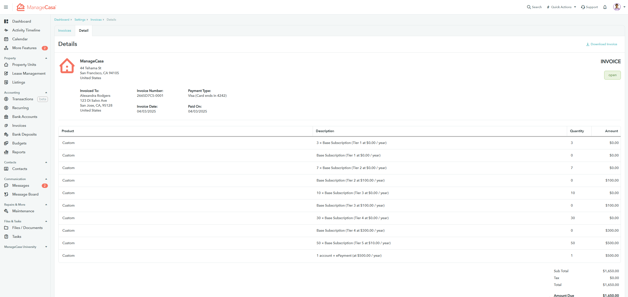 ManageCasa makes it easy to stay informed whenever you are invoiced for your subscriptions. You can view and download invoices at any time.