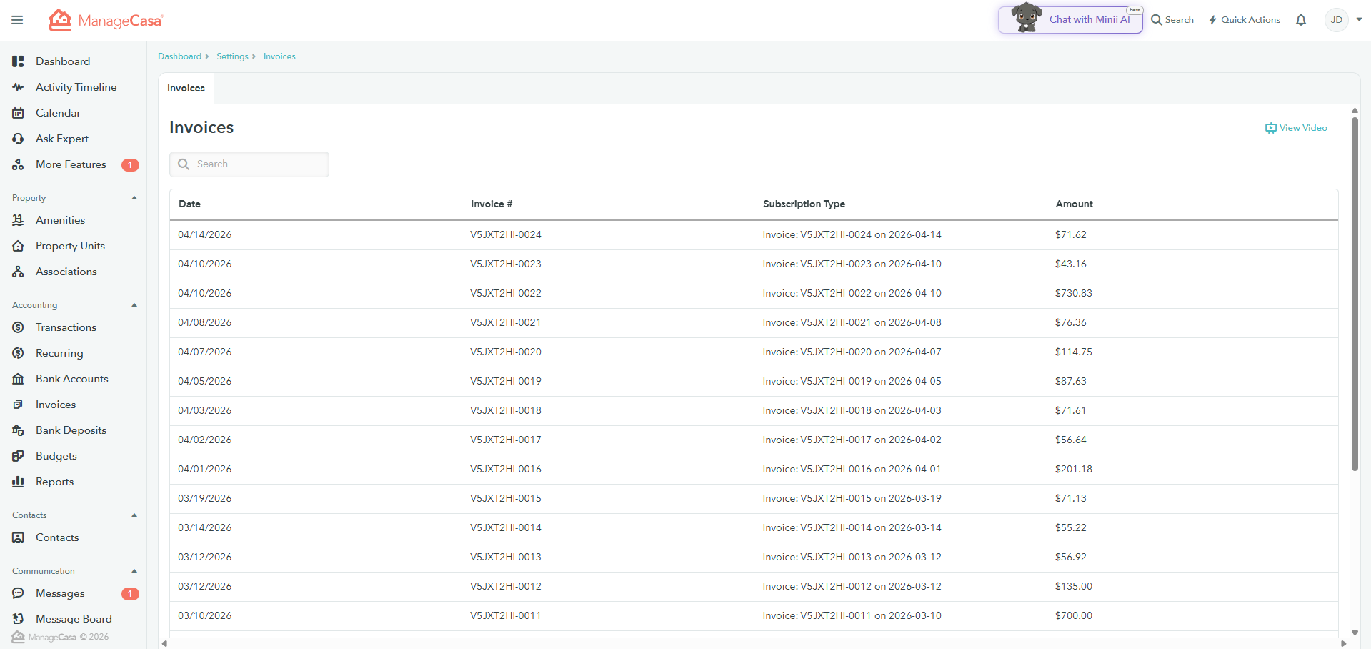 When you’re subscribed to ManageCasa, invoices are automatically sent to your email. You can also access the same invoices within the platform for a more detailed view.