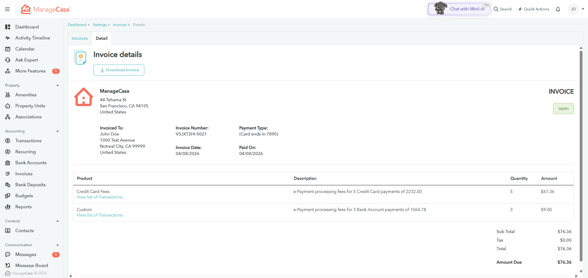 ManageCasa makes it easy to keep track of all your invoices in one place. Whether it’s your subscription charges or ePayment processing fees, you can view, review, and download them anytime directly from your account.