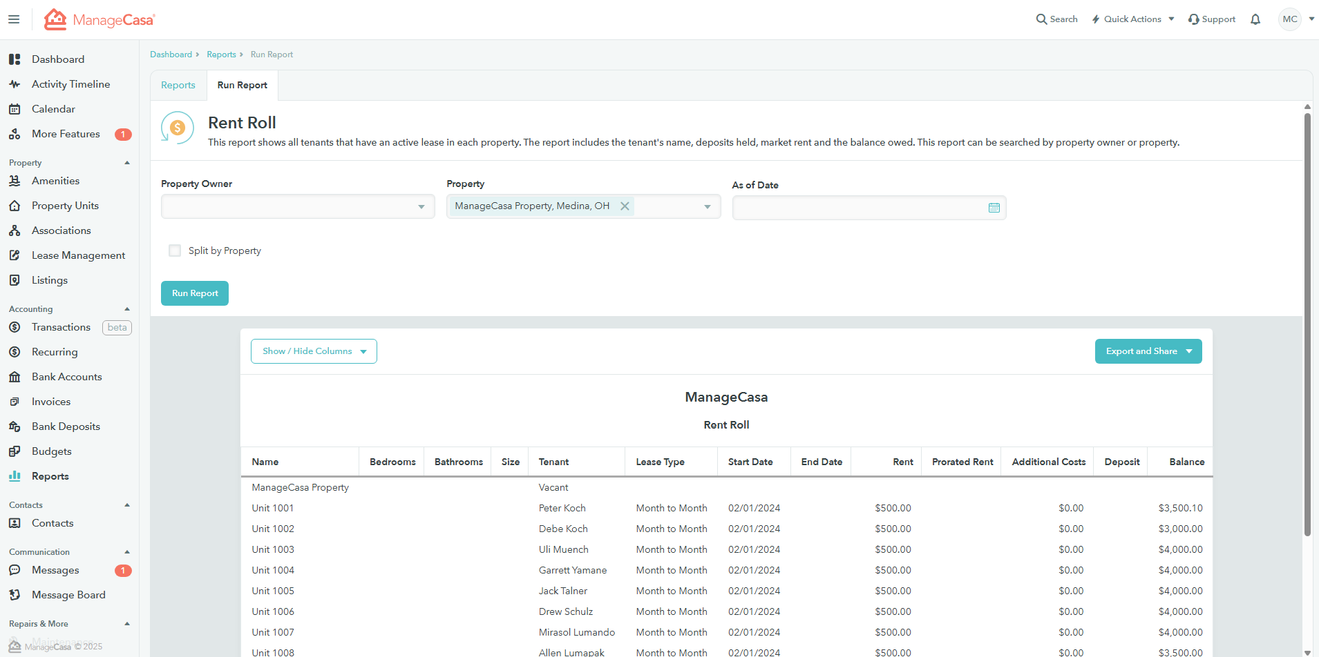 The Rent Roll is a critical report for anyone who manages multiple properties, offering an overview of your rent roll on a specific date. Creating this report on ManageCasa provides you with a detailed look at all tenants who have an active lease with each of your properties. You can see the tenant’s name, deposits held, market rent and if any balance is owed. The report can also be filtered and searched by property owner and property.
