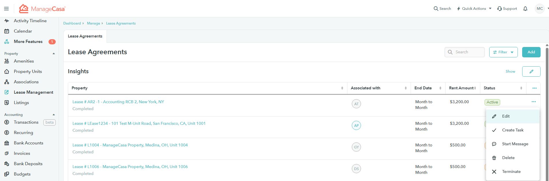 - Locate the lease you would like to terminate and click the " ... " on the right to open a drop-down menu.