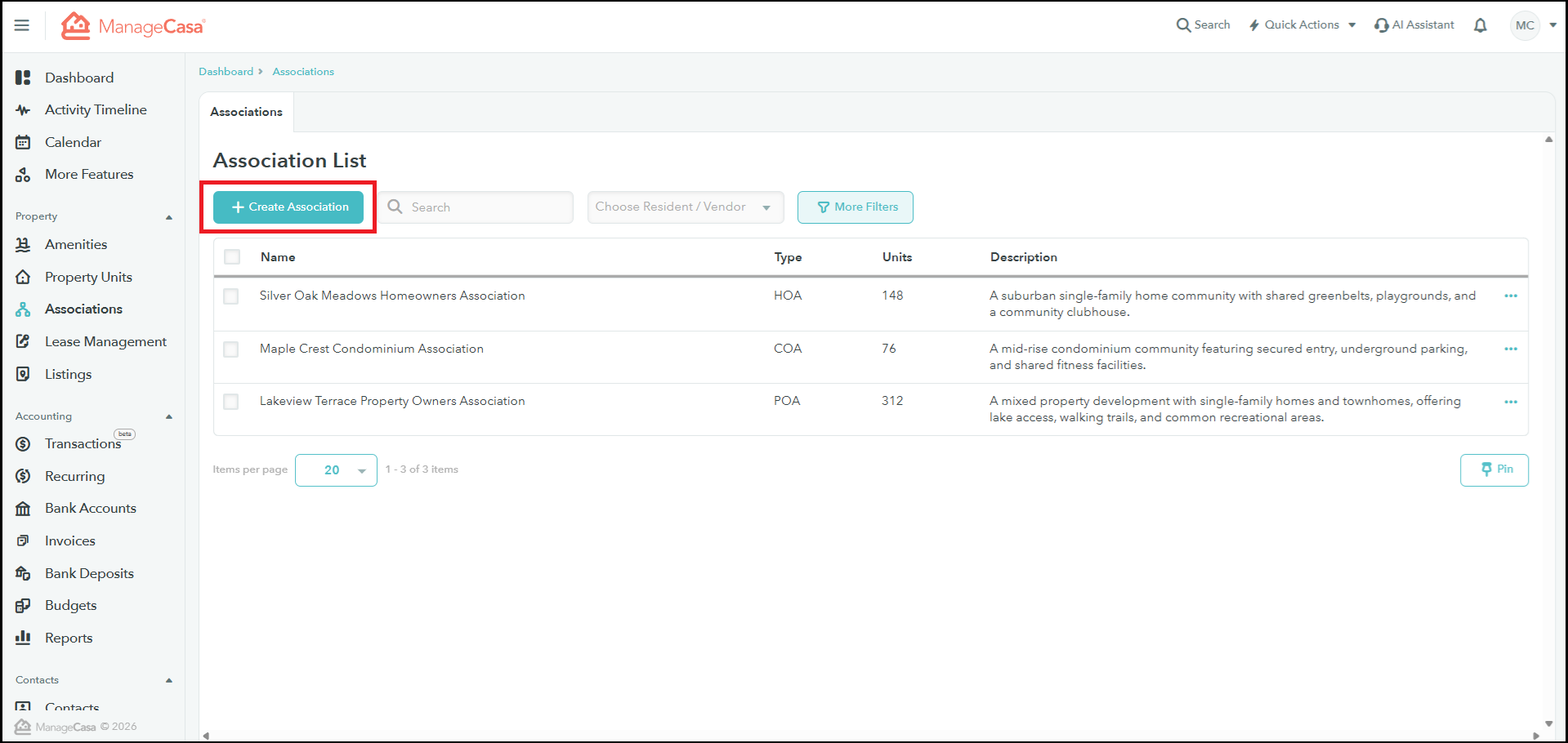1. In your ManageCasa account, go to the Associations tab → click “Create Association” or “Add” to begin.